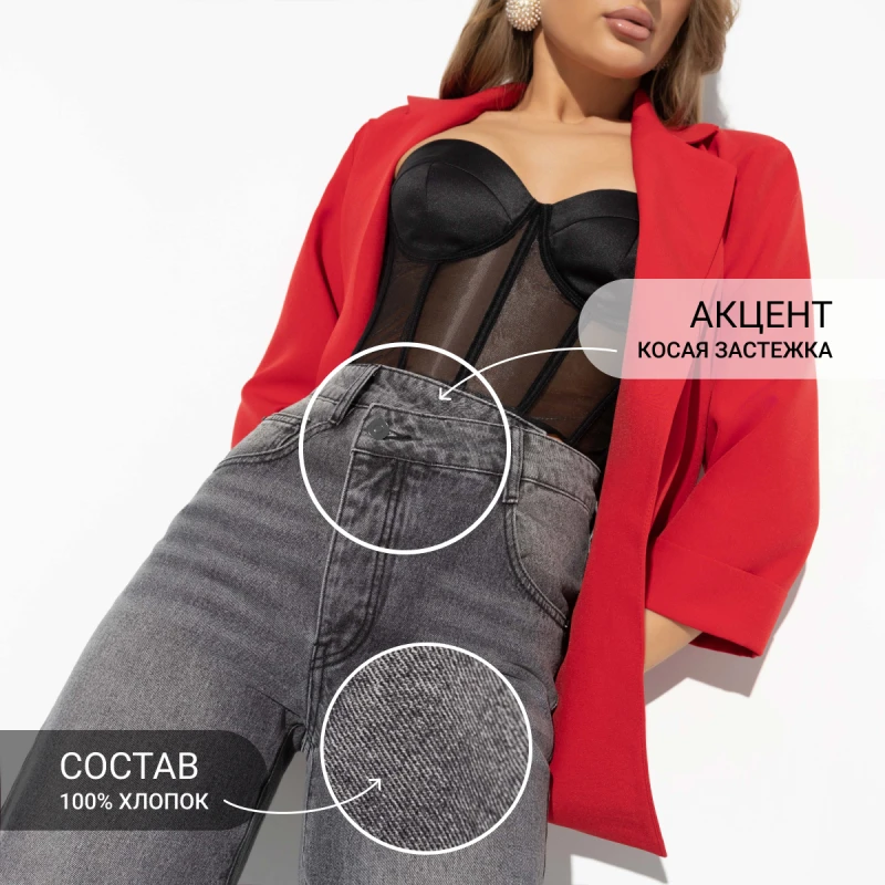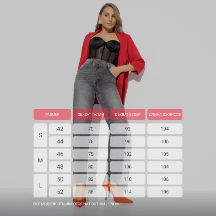 Состав «джинса» (100% хлопок) Длина изделия 42 размер - 105 см 44 размер - 105 см 46 размер - 105 см 48 размер - 105 см 50 размер - 105 см 52 размер - 105 см Комментарий стилиста Бабушка говорила, что у тебя всегда всё сикось-накось. Она тогда не знала, что ассиметричный крой станет мощным трендом. Теперь застежка джинсов будто «не туда» – в моде. Бабушка не поверит! Информация о товаре Эти джинсы пропитаны духом современной моды. С косой застежкой, они не только удивительно комфортны, но и выглядят невероятно стильно. Этот ассиметричный крой добавляет оригинальности вашему образу, делая его ярким и запоминающимся. Ощутите на себе уверенность и стиль с этими джинсами, которые будут привлекать восхищенные взгляды. Созданные из 100% хлопка, эти джинсы не только модные, но и невероятно удобные. Мягкая ткань обеспечивает комфорт при носке на протяжении всего дня, а высококачественный материал гарантирует долговечность изделия. Наслаждайтесь свободой движения и ощущением комфорта в этих стильных джинсах каждый день. Каждая деталь этих джинсов отражает богатое наследие моды. Ассиметричная застежка — это не просто тренд, это ода истории и стилю. Позвольте себе быть частью этой истории, добавляя в свой гардероб этот модный акцент. Давайте вместе создадим неповторимый образ, который будет говорить о вашем безупречном вкусе и знании моды.