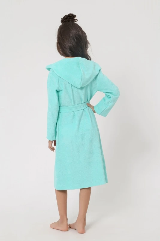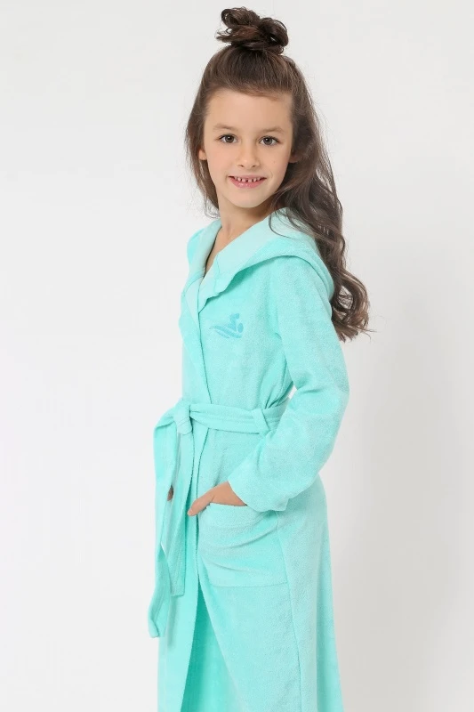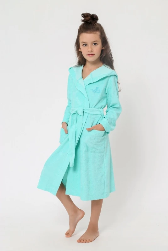 Артикул: ХД-036 Состав: 80% хлопок, 20% ПЭ Ткань: Махра Халат для девочки, из одностороннего махрового трикотажного полотна. Модель на запАх, с поясом в шлёвках, с боковыми карманами, с капюшоном и с небольшой вышивкой на левой полочке.