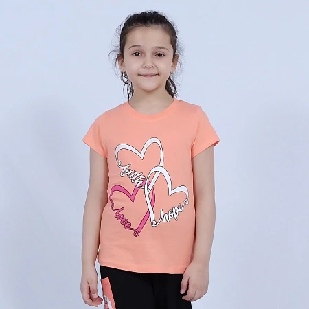 Основные характеристики: Цвет: Оранжевый Палитра - несколько основных цветов: "радуга", черный, белый, ... Остальная гамма цветов является их разновидностью, в наибольшей степени относится к одному из них.Вид одежды: ФутболкаПол: Для девочек