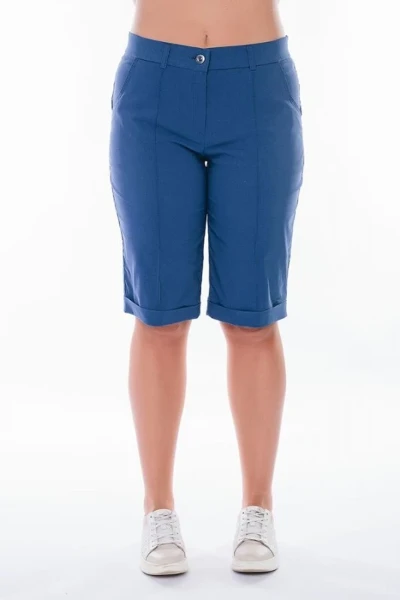 Бермуды с застроченной стрелкой в городском стиле. Детали: спереди застежка на молнию, боковые карманы, шлевки на поясе, по линии низа отворот, сзади под фигурной кокеткой накладные карманы. Отделка кокетки и карманов спереди - тройная строчка. Длина по внутреннему шву - 33 см. Ширина низа - 25,5 см. *Числовые параметры соответствуют размеру 48. Размер модели на фото: 46. Параметры модели:90-68-99. Рост модели на фото: 175 см. Состав ткани: Хлопок 63%, Полиэстер 35%, Эластан 2%