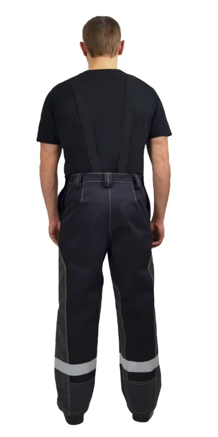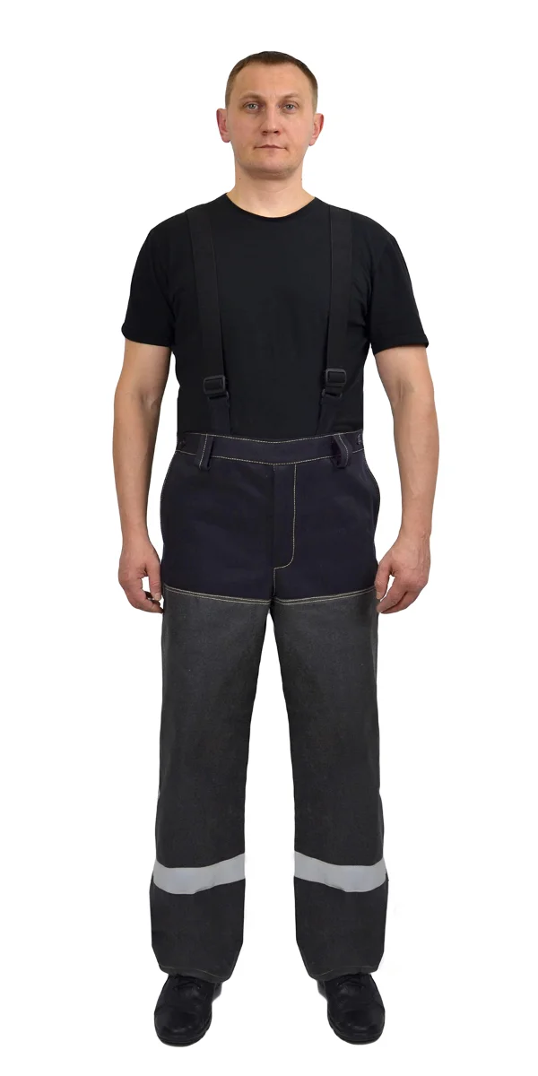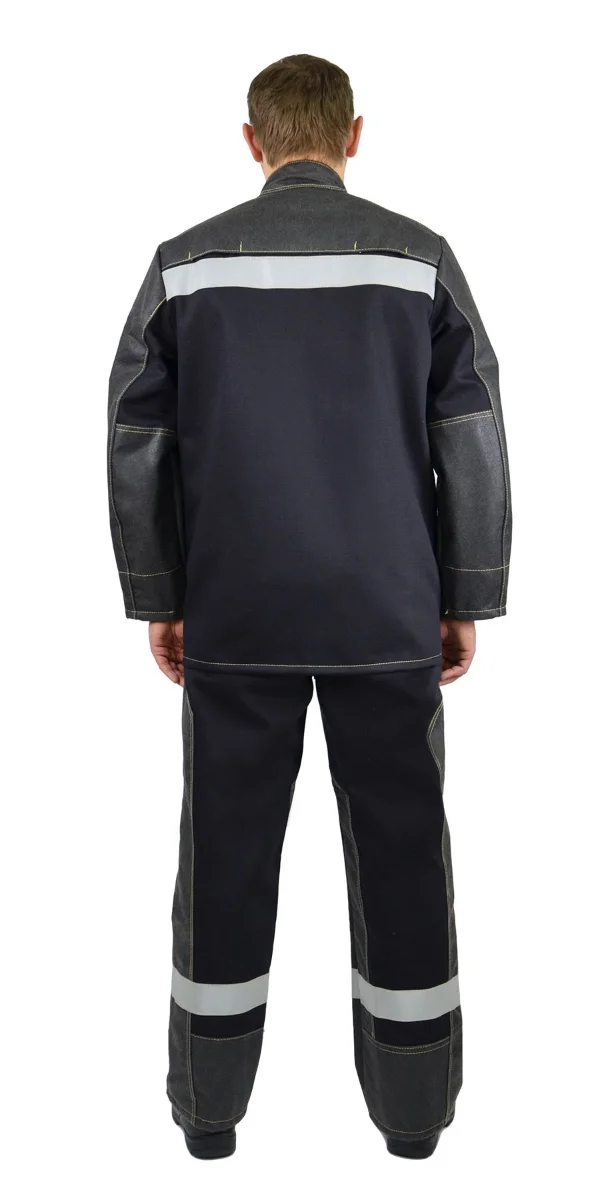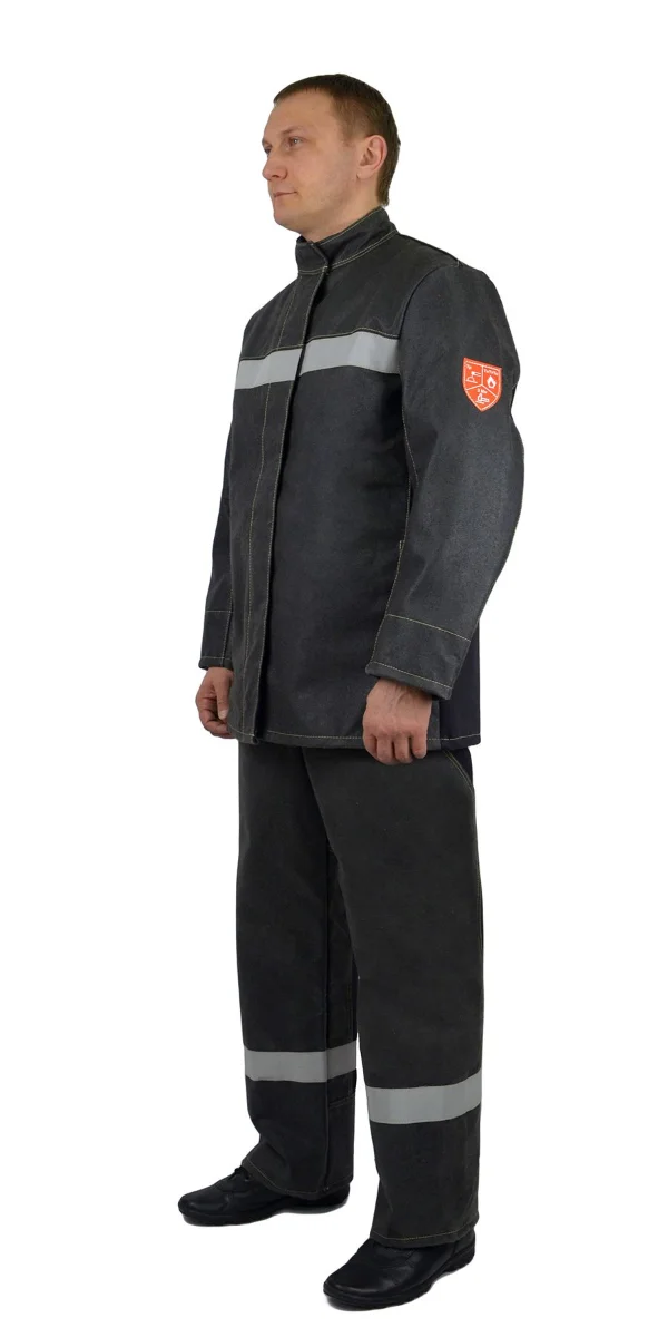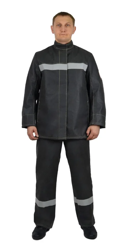 Составляющие: -Куртка -Брюки Материалы: -Основная ткань – 100 % хлопок плотностью порядка 500 гр./м. кв. с огнестойкой пропиткой устойчивой к стиркам -Ткань накладок комбинированная ткань 30% параарамид + 70 % панокс с нанесением из огнестойкого силикона -Световозвращающая полоса огнестойкая шириной 5 см. Описание костюма: -Куртка прямого силуэта, с центральной, потайной правосторонней застежкой на пять пуговиц, с воротником «стойка», со световозвращающей полосой на уровне груди. -Полочка с защитными накладками – кокетки, центральные и боковые части. В рельефном шве соединения накладок полочки расположены внутренние карманы. На правой полочке расположен внутренний накладной карман. -Спинка с отрезной кокеткой и защитной накладкой на кокетке. В шве притачивания кокетки расположены вентиляционные отверстия. -Рукава втачные, двухшовные, с локтевым и передними швами с внутренними напульсниками из огнестойкой ткани с эластичной лентой по низу. Верхняя и передняя части рукава усилены накладками по всей площади. Локтевая часть рукава с усилительной накладкой ниже уровня проймы. -Воротник «стойка» с подворотником из огнестойкой ткани, с застежкой на контактную ленту. -Брюки прямого силуэта, с пристегивающимися бретелями, с откидывающейся передней частью, с центральной застежкой «гульф» на «молнии и боковыми застежками на одну обметанную петлю и пуговицу, с внутренними боковыми карманами, со световозвращающей полосой по низу брюк и шлевками, расположенными - две на передних половинках и три на задних. -По низу задних половинок и вдоль шаговых швов – настрочены защитные накладки. -Бретели из эластичной ленты, регулируемые по длине и пристегивающиеся на петли и пуговицы к поясу передних и задних половинок. Защитные свойства: ТрТоТиТтЗМи Класс защиты ТР 3 Уровни защиты А1В1С1 Изготовлен в соответствие с СТО 03857273-002-2022 Применяемые стандарты: -ГОСТ 12.4.250-2019 -ГОСТ ISO 11612-2020 Соответствует требованиям ТР ТС 019/2011