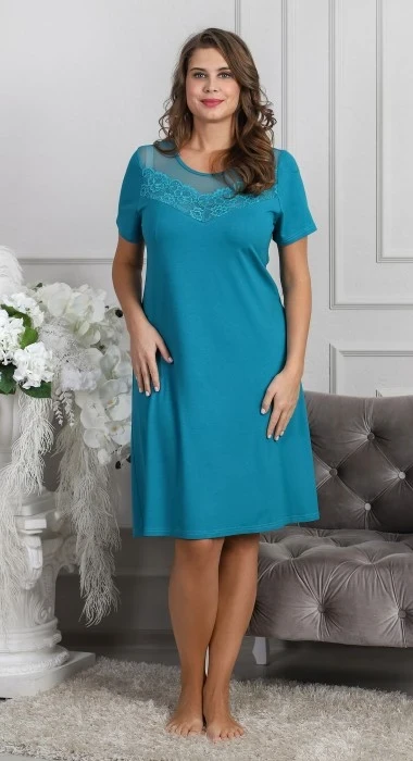 Состав: 92% вискоза, 8% лайкра/100%ПЭ Ткань: Вискоза/сетка Сорочка из гладкокрашеного трикотажного вискозного полотна, слегка расширенная книзу, с короткими втачными рукавами и горловиной овальной формы, окантованной основным материалом. На полочке и спинке – притачные кокетки v-образной формы, выполненные из полотна «сетка», с настроченными на них кружевными деталями.
