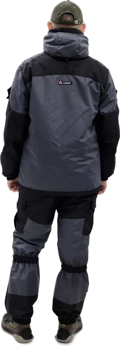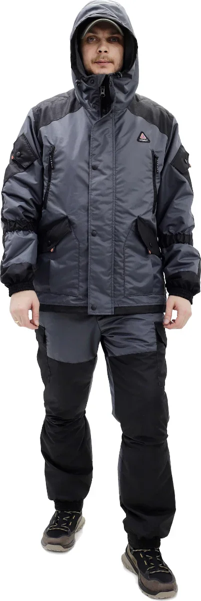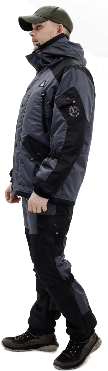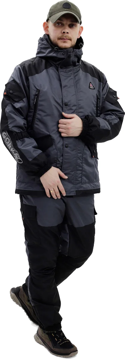 Влагостойкий двухцветный костюм. Прямая модель с высокими брюками на подтяжках. Непромокаемые молнии. Внутренняя ветрозащитная планка. Подклад на куртке и брюках - флис. Молния на куртке Трактор8 2-бегунка. Брюки на регулируемых подтяжках. Куртка шесть карманов внешних и один внутренний карман на молнии. Утяжки-регулировки по талии и по низу куртки. Резинка-утяжка(особенность горок) ниже локтей и по низу брюк чуть выше икр. Две утяжки капюшона по овалу лица и глубине. Усиления на локтях, плечах и коленях. Брюки четыре кармана. Температурный режим от + 15 до +5 С. В активном режиме до - 5 С.