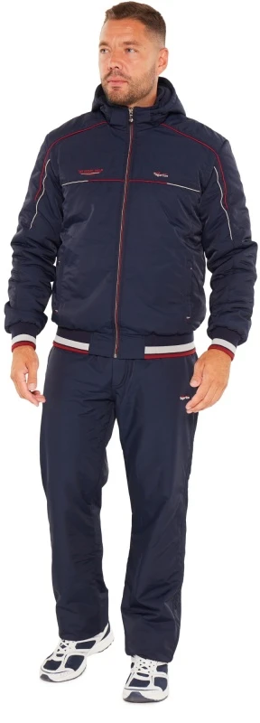 Материал: Twill Nylon/polyester W/R, PU нейлон 51% полиэстер 49% Отделка: 300T Nylon Taffeta нейлон 100% Цвет : темно-синий гранат Размеры: L - 2XL Куртка с отстёгивающимся капюшоном. Ткань с полиуритановым покрытием (PU) с внутренней стороны обеспечивает защиту от влаги. Капюшон фиксируется с помощью контактной ленты (липучки). Пояс выполнен из 3-х цветной рибаны. Утеплитель куртки синтепон и флисовая подкладка. Для удобства надевания изделия в рукавах вместо флисовой подкладки используется таффета. Молния в борт декорирована цветными нитками (светло-серый/гранат). В рельефы рукавов и передней кокетки вставлены цветные канты. Слева и справа на груди цветные вышивки в фирменном стиле. Передние карманы на молниях под листочками, декорированными вышивками. С левой стороны расположен горизонтальный внутренний карман на молнии. Брюки с поясом на резинке. Брючины заужены к низу. С внутренней стороны пояс фиксируется шнурком. Карманы на молниях под листочками.