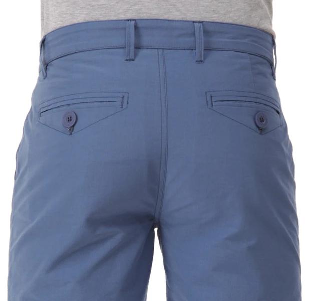 Материал: Твил (полоска) хлопок 97% спандекс 3% Шорты с жёстким поясом и гульфиком из хлопковой ткани твилового плетения с добавлением спандекса. Лицевая сторона ткани гладкая, изнаночная имеет рельефную структуру в виде мелкого рубчика, который просматривается снаружи в виде узких полос. Лекало молодёжное зауженное. Пояс со шлёвками под ремень. Бока отстрочены тройным швом. Передние карманы полукруглые, отделаны по краю тонким кантом. Справа дополнительный карман – пистон. Задние карманы выполнены в рамочку, отстрочены по контуру, закрываются пуговицами. Изделие прошло влажно-термическую обработку.