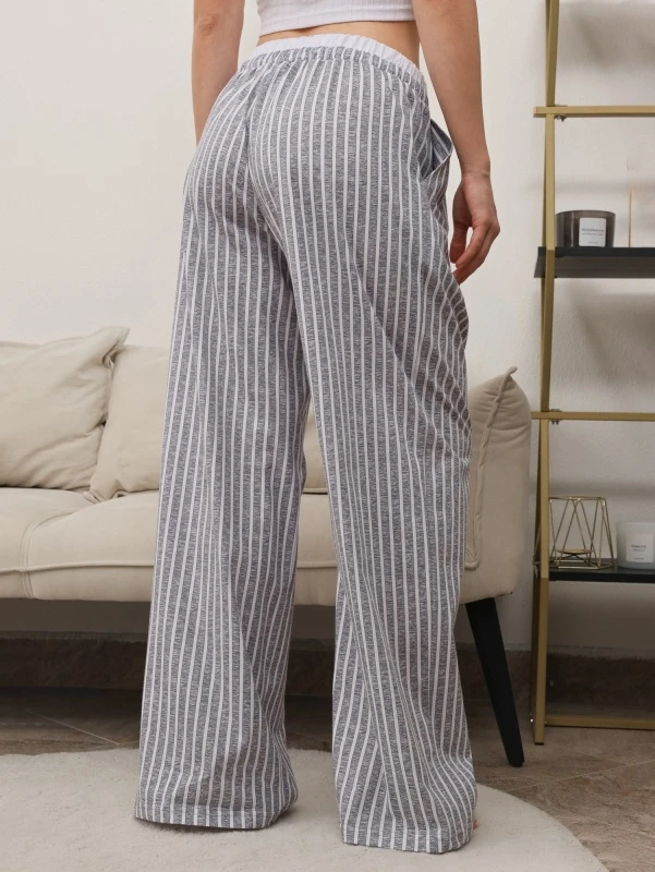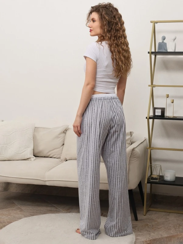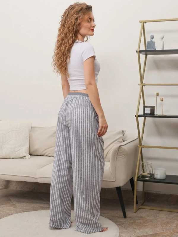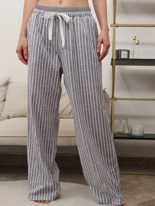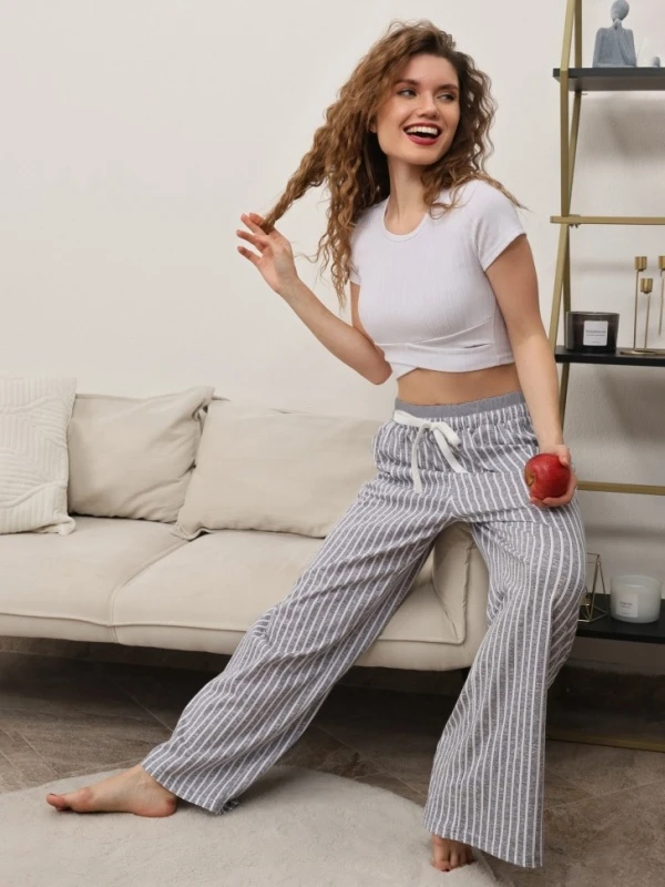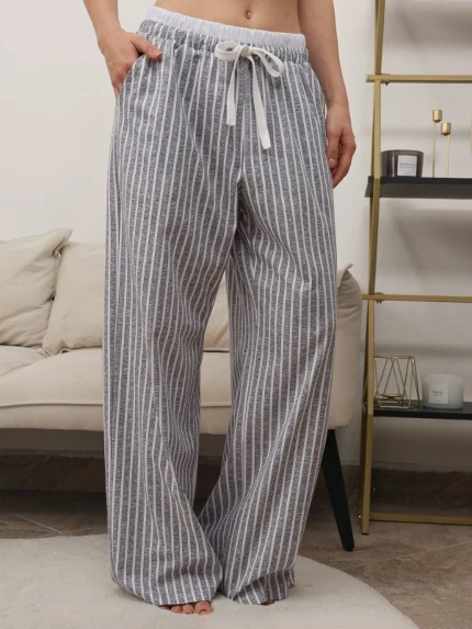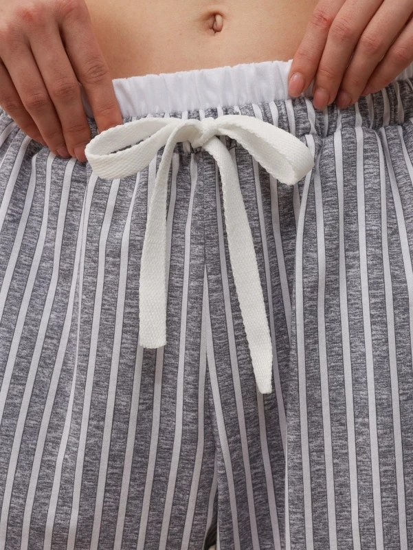 Состав: Хлопок 100% Ткань: Кулирка Брюки - молодежные из трикотажного полотна «кулирка» с набивным рисунком «полоска», длинные, свободные, на притачном поясе с эластичной тесьмой внутри, выполненным из двух видов ткани: с набивным рисунком и гладкокрашеной. В пояс вставлен декоративный шнурок, продетый через две обметанные петли в центре пояса.