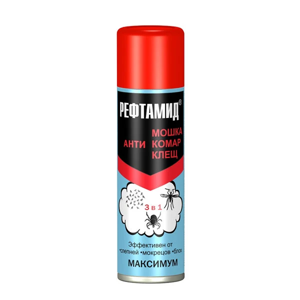 РЕФТАМИД Максимум Аэрозоль 3 в 1. Универсальный препарат для защиты людей от нападения комаров, мошки, лесных и таёжных клещей. Содержит высокоэффективный действующий компонент, сохраняет своё действие в течение длительного времени.