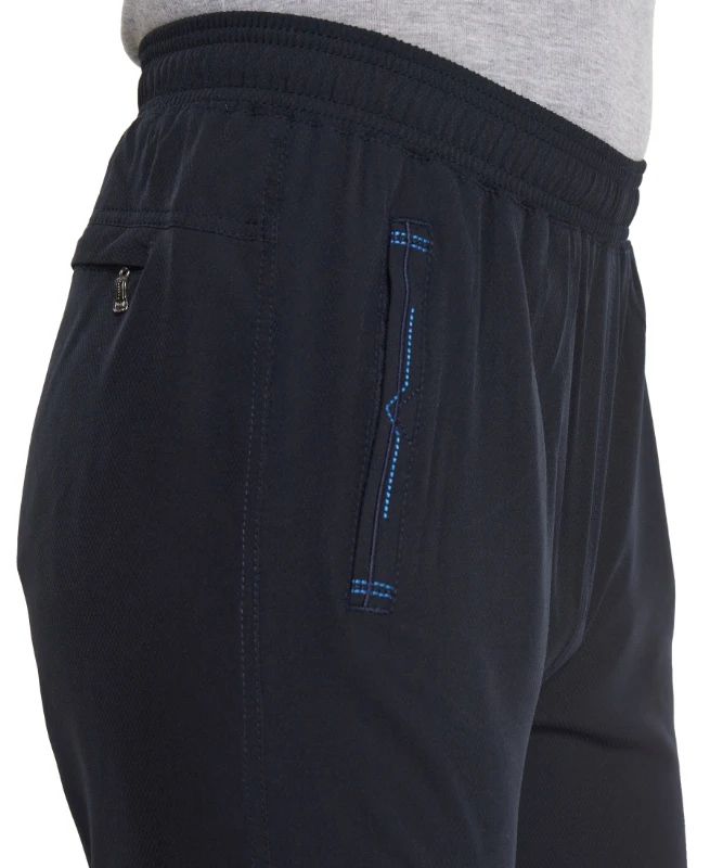Материал: Жакард бистреч полиэстер 95%, эластан 5% Цвет (основной/отделка): темно-синий/гранат темно-синий/парламент Размеры: M - 5XL Летние брюки с поясом на резинке. Для дополнительной фиксации с внутренней стороны в пояс вставлен шнурок. Брючины немного заужены книзу. Отшиты из тонкого синтетического материала, содержащего жаккардовые нити и эластан. Нити эластана расположены как по утку, так и по основе ткани, что придаёт материалу чрезвычайную подвижность, формоустойчивость и комфорт в носке. Жаккардовые нити формируют слабовыраженный рельефный рисунок. Ткань мягкая, приятная на ощупь, не нагревается в жару и создаёт ощущение прохлады. Передние карманы на молниях под листочками, декорированными цветными вышивками. Под левым карманом вышивка в фирменном стиле.