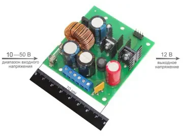 ПН-12-1,5 (встраиваемый модуль на печатной плате размером 80х70x40 мм) преобразует нестабилизированное входное напряжение от 10 до 50 В постоянного тока в выходное стабилизированное напряжение 12…15 В постоянного тока для питания нагрузки с током потребления до 1,5 А