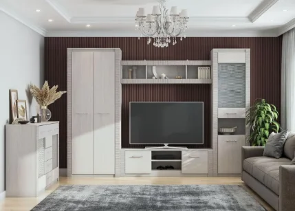 Гамма 20 - качественная фабричная мебель, создана из экологически чистых материалов, оснащенная долговечной фурнитурой и предназначенная для современной гостиной и спальни. Благородство фасадов и корпусов, выполненных в светлой древесной тонировке, подчеркнуто вертикальными фасадными накладками, выполненными в тон фасада и декорированными волнистой фрезеровкой. Корпус и фасады - ЛДСП 16 мм «Ясень Анкор светлый». Декоративные элементы - планки МДФ 16 мм «Сандал светлый» с неокрашенной обратной стороной. Стеклостворки сборные. Стекло 4 мм с еврообработкой и фотопечатью «Волна». Ручки: SV-14 (С39 хром) 128_160mm Опоры: Цоколь без выреза под плинтус. Петли: Стандарт, без доводчиков. Направляющие выдвижных ящиков: Стандарт, роликовые.